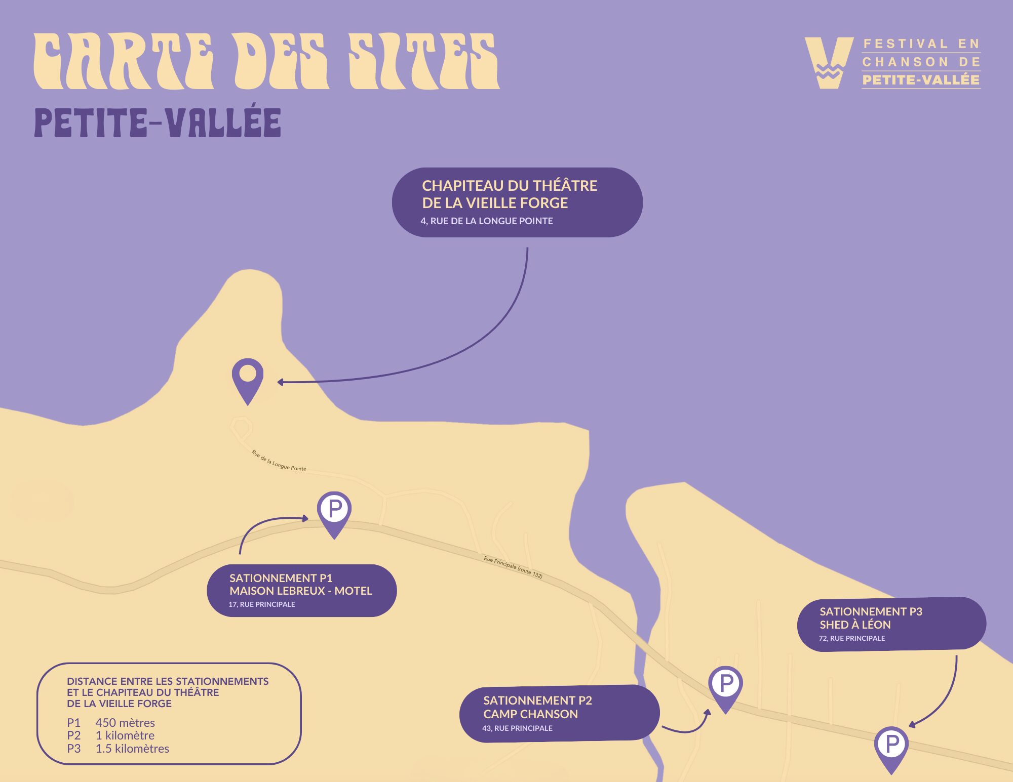 En raison des travaux de construction du nouveau Théâtre de la Vieille Forge, les espaces de stationnement autour de notre quartier général sont considérablement réduits. Ainsi, différents stationnements seront disponibles à divers endroits de Petite-Vallée, et un service de navettes sera mis en place pour assurer la liaison entre ces stationnements et le quartier général du festival.